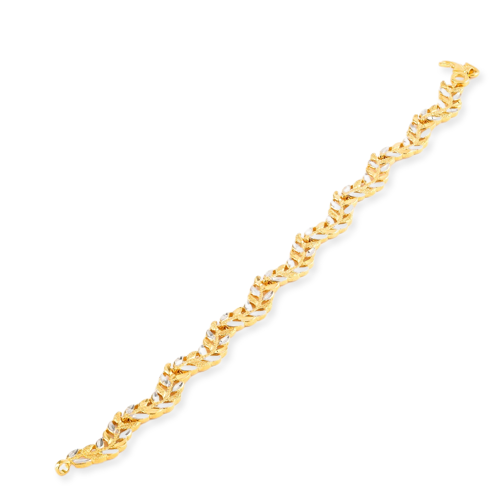Bu bileklik, cilalı 22 ayar altın halkalardan oluşan karmaşık bir örgü desenine sahiptir ve bilek çevresinde zarif bir zikzak akışı yaratır. Her halka, doku ve hareketi zenginleştiren yumuşak bir iki tonlu kontrast ekleyen bir dokunuşla rodyumla vurgulanmıştır. Sıcak altın ve soğuk rodyumun etkileşimi, zamansız bir zarafeti korurken parçaya modern ve göz alıcı bir çekicilik katar.