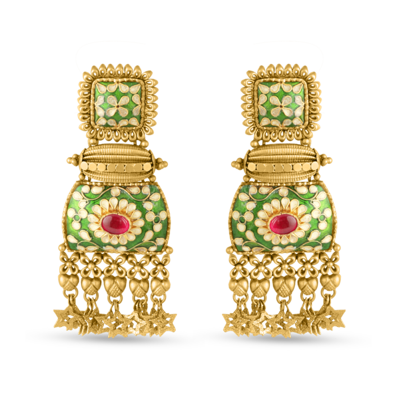 Şıklığınızı bu zarif 22ct Altın Damla Küpeler. Saf 22 ayar altından titizlikle üretilen bu küpeler, lüks ve gelenekselin uyumlu bir karışımını sergiliyor. zanaatkarlık. Zengin altın tonu, karmaşık altın rengi ile güzel bir şekilde tamamlanır. emaye detaylarBu da her bir parçaya canlı bir renk sıçraması ve sanat katıyor.