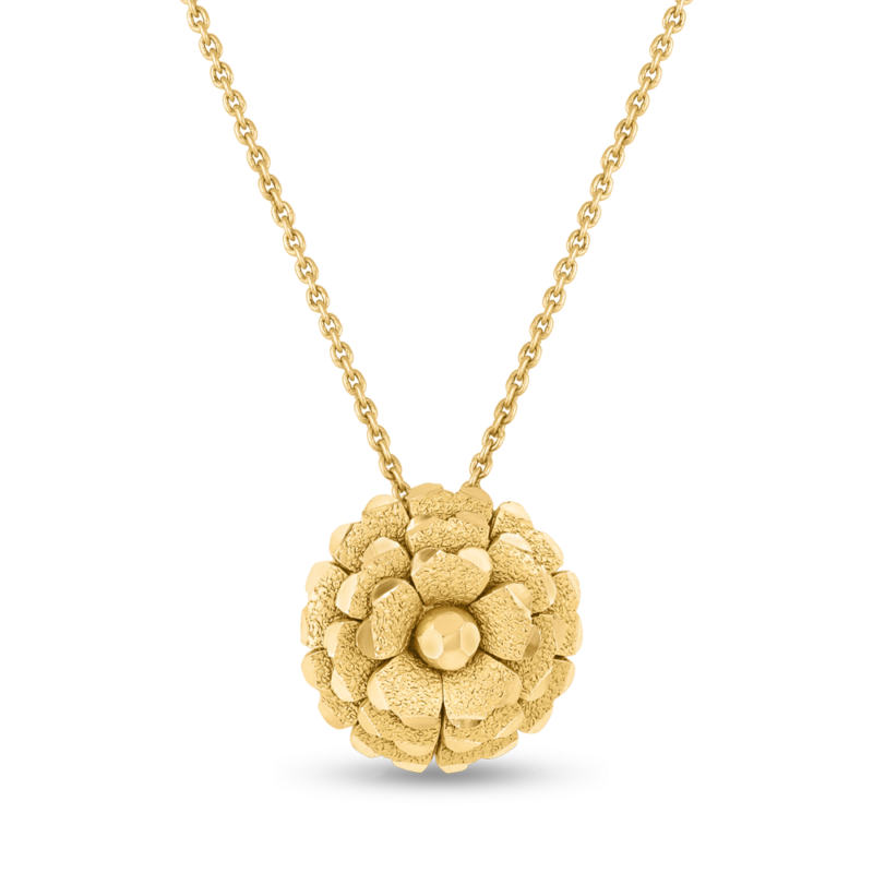 Bu 19 mm'lik rozet kolye, tamamen açılmış bir çiçekten esinlenerek tasarlanmıştır. Parlak bir merkez boncuk etrafında nazikçe kıvrılan katmanlı yaprakları vardır. Yuvarlak şekli, yakasının ortasına düzgün bir şekilde oturarak yumuşak ama aynı zamanda şekillendirilmiş bir siluet oluşturur. Detaylı dokusu ve boyutlu yaprakları, onu Rosettes koleksiyonunda ayırt edici bir parça haline getirir.