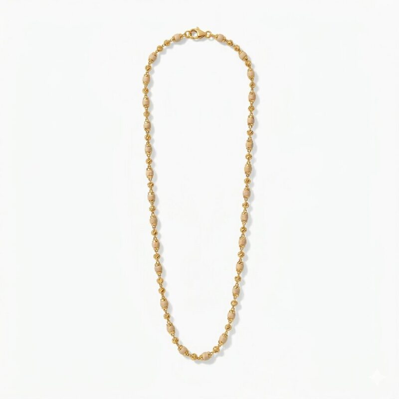 Zengin 22 ayar altından üretilen her bir boncuk, tutarlı ve akıcı bir yapı elde etmek için ayrı ayrı şekillendirilmiş ve hassasiyetle bir araya getirilmiştir. Parlatılmış altın bağlantılar ve dokulu Tulsi boncuklar arasındaki hassas etkileşim, yetenekli zanaatkârların uzmanlığını sergileyerek hem görsel incelik hem de kalıcı dayanıklılık sağlar. Londra Tahlil Ofisi tarafından damgalanan parça, PureJewels'in mükemmelliğe olan bağlılığını yansıtarak özgünlüğü ve saflığı garanti eder. .