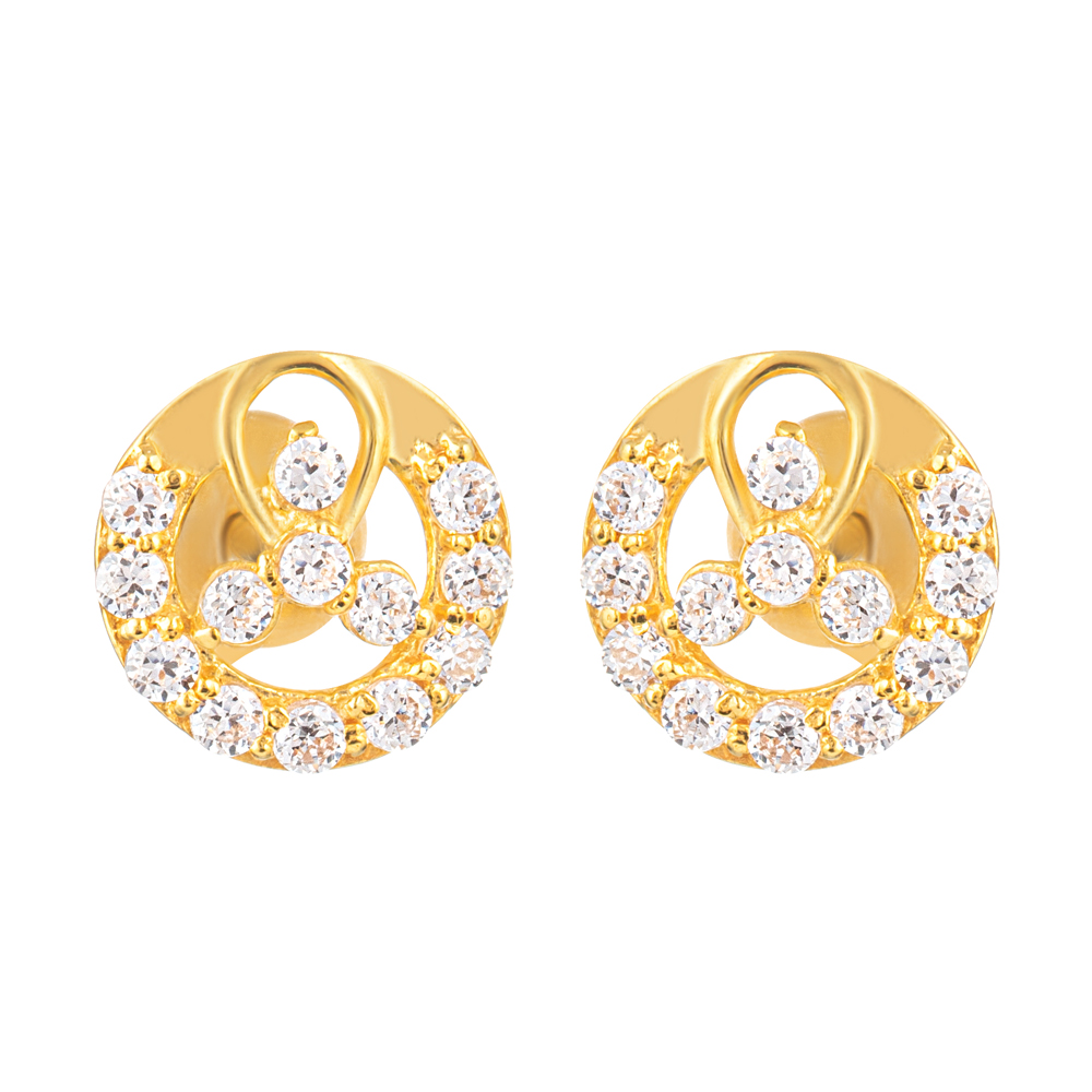 Bu 22 ayar altın yuvarlak saplama küpeler, dairesel simetri ve akıcı formların güzelliğinden ilham alıyor. Açık dairesel motif, bir parlaklık halesi oluşturan ışıltılı CZ taş kümesiyle zenginleştirilmiştir. Kavisli iç altın unsur, dengeli ve çağdaş bir estetiği korurken tasarıma hareket ve derinlik katıyor.