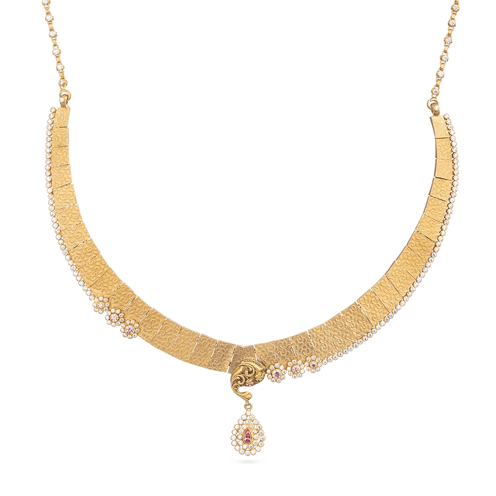 Geleneklere bağlı modern gelinler için tasarlanan bu Polki Gelin Kolyesi içinde 22 ayar altın zarif bir gül rengi kaplama ve narin Polki taşları. Cesur, oyulmuş siluet, karmaşık oyma ve zarif çiçek kaskadıyla yumuşatılmıştır.