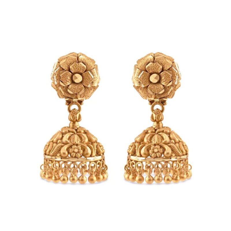 Yüksek saflıkta 22 ayar gündoğumu altından ustalıkla üretilen küpelerde yontulmuş çiçek motifleri ve ince detaylı kubbe yapıları yer alıyor. Her bir unsur, doku derinliği ve narin hareket yaratmak için hassasiyetle şekillendirilmiştir.