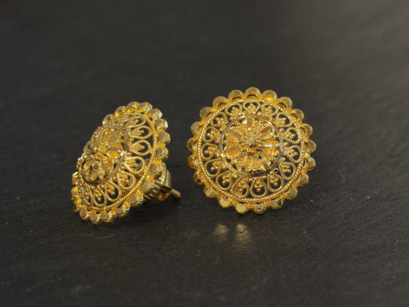 Bu 22 Ayar Altın Telkari Saplama Küpeler, gerçekten sofistike bir görünüm için karmaşık tasarımı klasik lüksle harmanlayan, sahip olunması gereken bir aksesuardır.