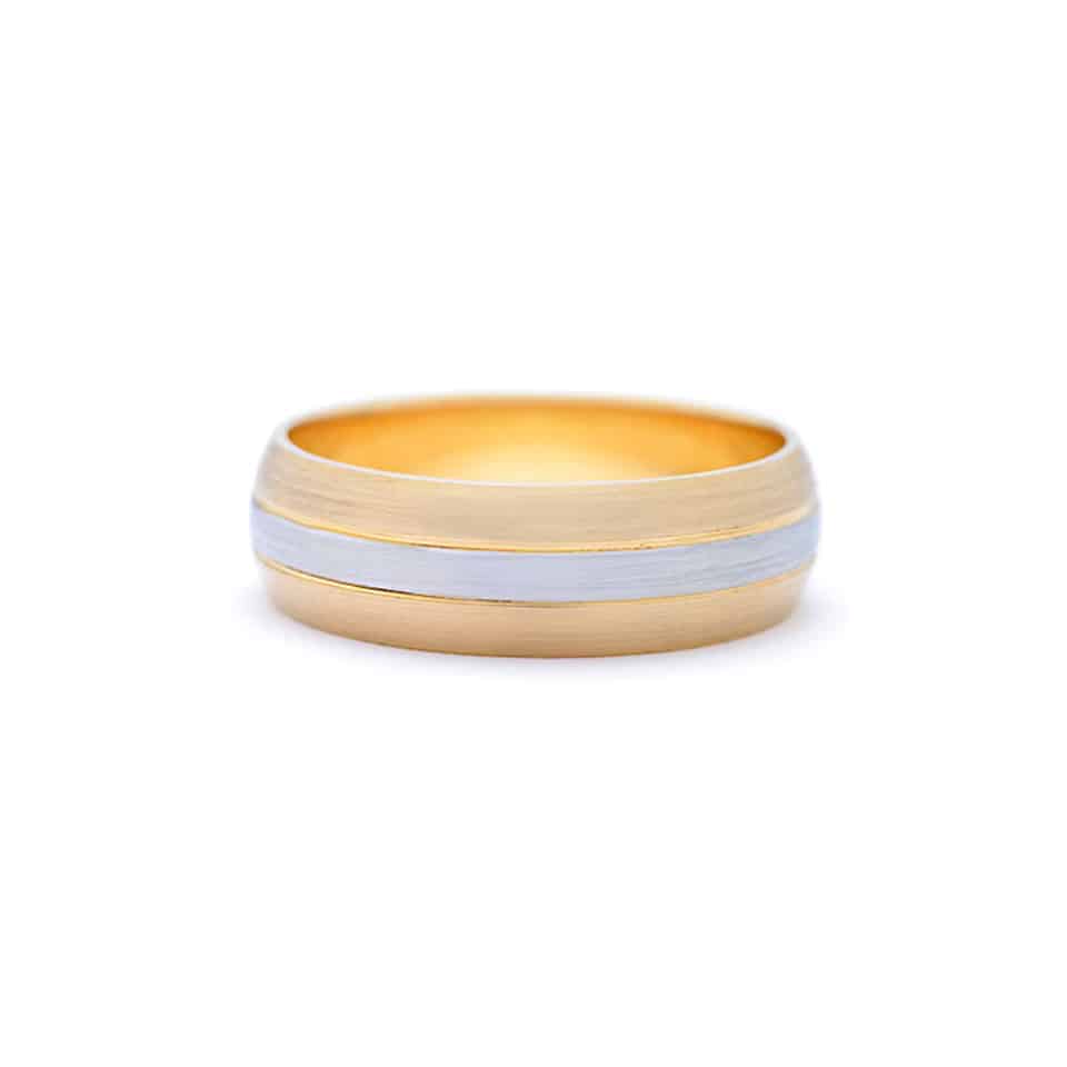 Rahat ve şık bir avlu şeklindeki bitiş için profili neredeyse hiç değiştirmeyen çarpıcı bir platin kakma ile hazırlanmıştır. Her iki metal de mat bir parlaklıkta fırçalanmıştır, bu da bu zarif ve abartısız alyansın cazibesini artırmaktadır.