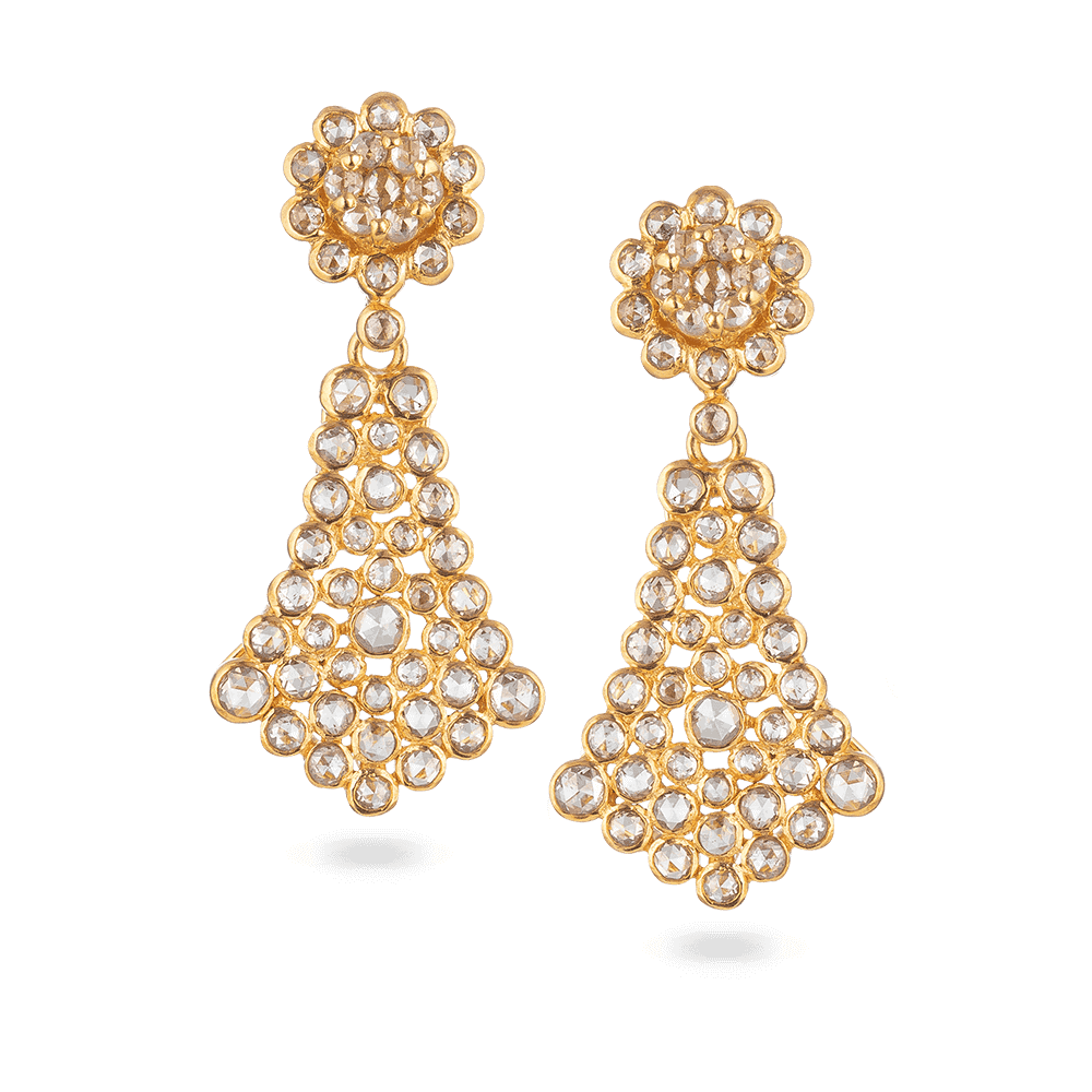 Zengin 22 ayar altınla el yapımı, her biri Küpe titizlikle yerleştirilmiş kesilmemiş Polki elmaslar, doğal parlaklığıyla değer verilen geleneksel bir Hint kesimi. Üst kısımdaki çiçek kümesi, parlak bir çiçek oluşturarak parçaya zarafet katarken, kademeli üçgen damla yapısı akıcılık ve hareketlilik yaratır. Yetenekli zanaatkarlarımız, her bir Polki taşının hassas bir şekilde yerleştirilmesini sağlamak için asırlık Kundan ayar tekniklerini kullanır ve böylece miras kalitesi bir sonuç elde edilir. Her bir çift, PureJewels'in tasarım mirasının özgünlüğünü ve bütünlüğünü onurlandırmak için damgalanmış ve özenle üretilmiştir.