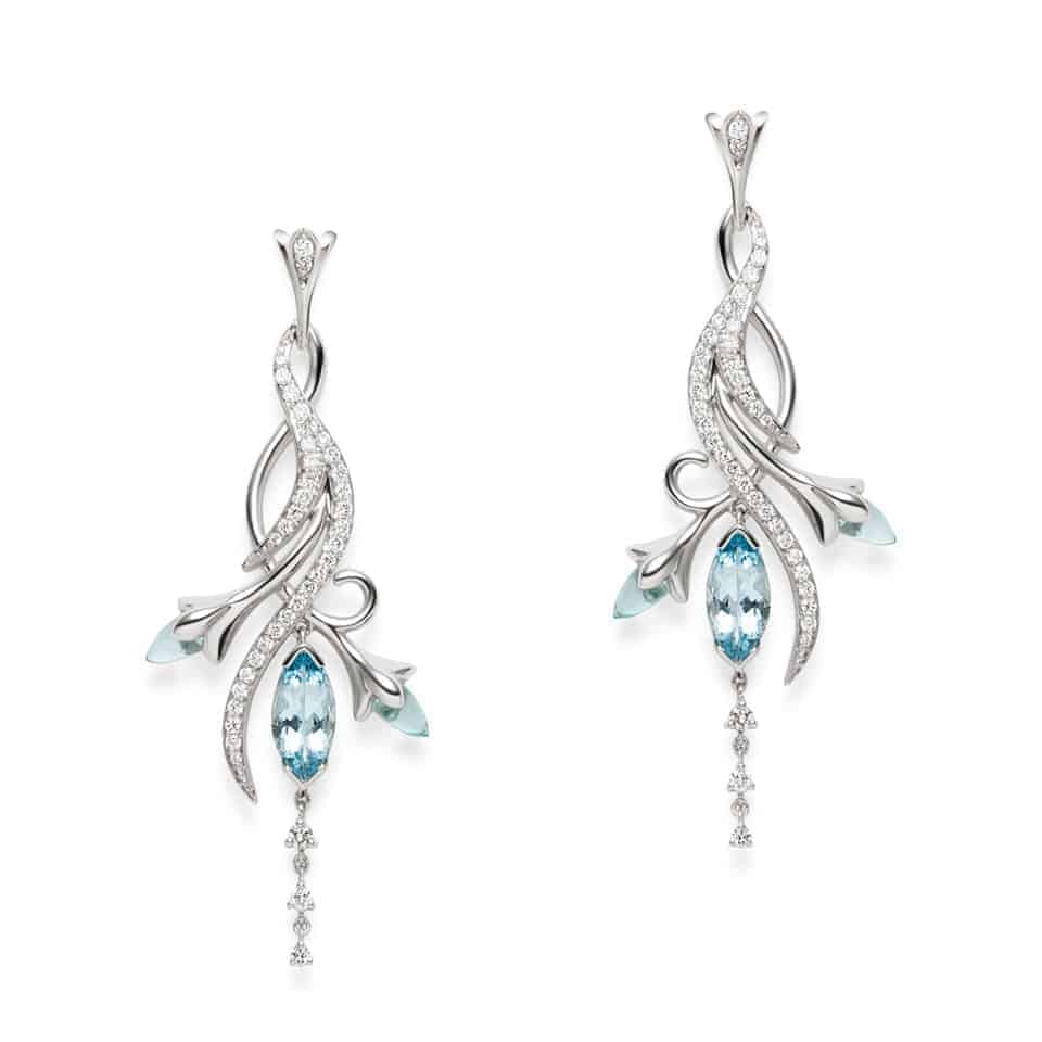 Floralia akuamarin renginde organik kıvrımlar ve utangaç tomurcuklarla dolu bir koleksiyon. Gece açan yaseminlerle dolu yemyeşil bir bahçede bir yürüyüş. En iyi 18 ayar beyaz altından üretilen Floralia Küpeler PureJewels ekibi tarafından tasarlanmıştır.