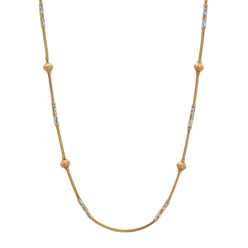 22 ayar sarı altından ustalıkla üretilen kolye, cilalı altın ve rodyum detaylı boncuklarla serpiştirilmiş pürüzsüz bir yılan zincirine sahiptir. Hafif yapısı gün boyu rahatlık sağlarken, tokası güvenli ve gizlidir - günlük kullanım için idealdir. Her bir parça Londra Assay Office tarafından damgalanarak saflığı ve güveni garanti eder.