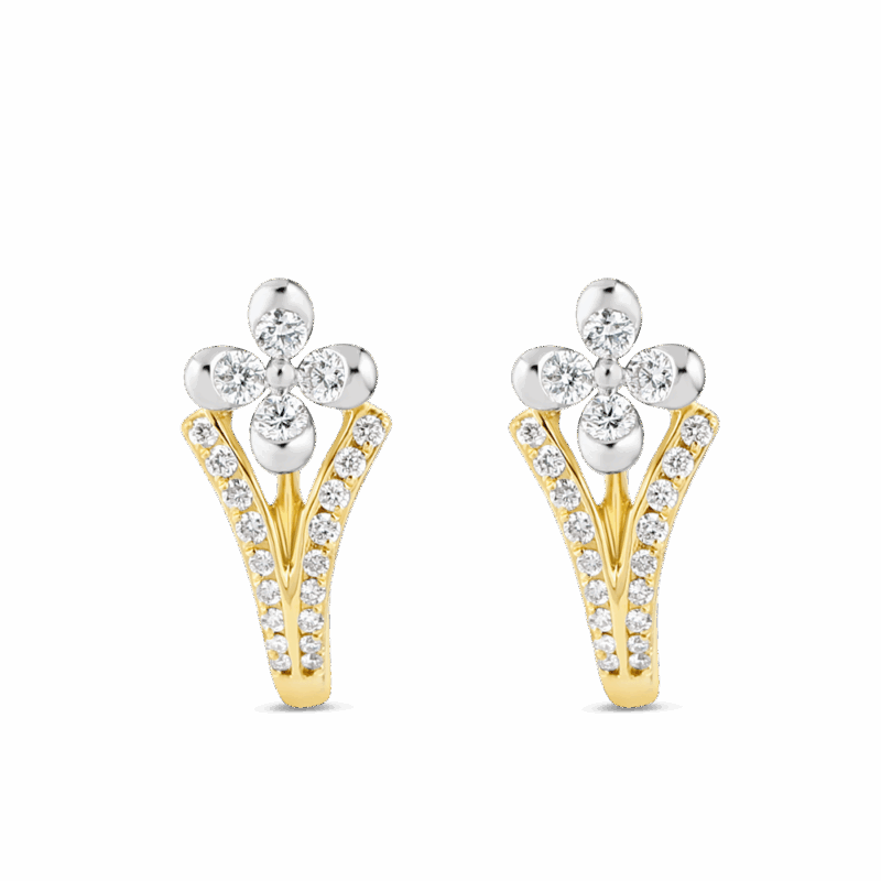Zarif bir işçilikle hazırlanmış bu 18 ayar altın küpelerle günlük şıklığınızı artırın. Zarif bir çiçek motifiyle tasarlanan her bir küpe, ışıltılı beyaz ve sarı altına yerleştirilmiş parlak kesim pırlantaların büyüleyici bir düzenlemesini sergiliyor. Titizlikle dizilmiş pırlantalarla bezenmiş V şeklindeki siluet, zamansız sanata saygı gösterirken modern bir incelik katıyor.