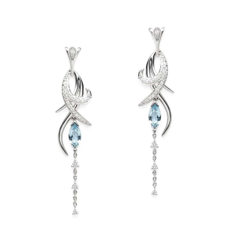 Bu küpeler 0,38 ct pırlanta ile süslenmiştir ve akuamarin (burada görülüyor) veya seçtiğiniz taş ile yapılabilir. Kadınsı pembe turmalin, pembe renkli morganit, iddialı yeşil turmalin veya rüya gibi aqua arasından seçim yapın. Hangisini seçtiğinize bağlı olarak Liana Küpeler biraz da sizin kişiliğinize bürünüyor!