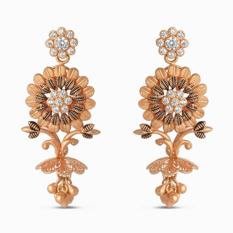 Gül Altın Polki Çiçekli Küpelerimizle işçiliği ve geleneği kutlayın. Lüks 22 ayar pembe altından üretilen her bir küpe, ışıltılı sentetik Polki taşlarıyla vurgulanan parlak bir çiçek motifine sahiptir. Karmaşık taç yaprağı detayları ve narin yaprak desenleri ince sanatı yansıtırken, nazik damla daha fazla hareket ve zarafet için büyüleyici altın boncuklarla tamamlanmıştır.