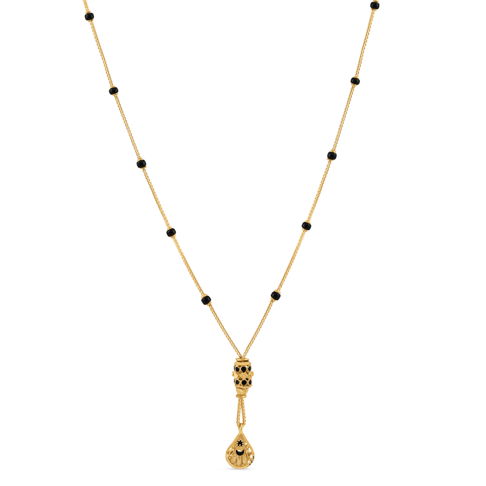 Bu 22ct Sarı altın süslü mangalsutra, ince altın zincir üzerinde cilalı siyah boncuklarla süslenmiş zarif 18 inçlik bir profile sahiptir. Kolye ucu, karmaşık detaylara sahip çift damla tasarımıyla parçaya zenginlik ve hareket katmaktadır. Damla şeklindeki alt charm ve dokulu üst eleman, gelenek ile çağdaş zarafeti harmanlayan zarif bir odak noktası oluşturmaktadır.